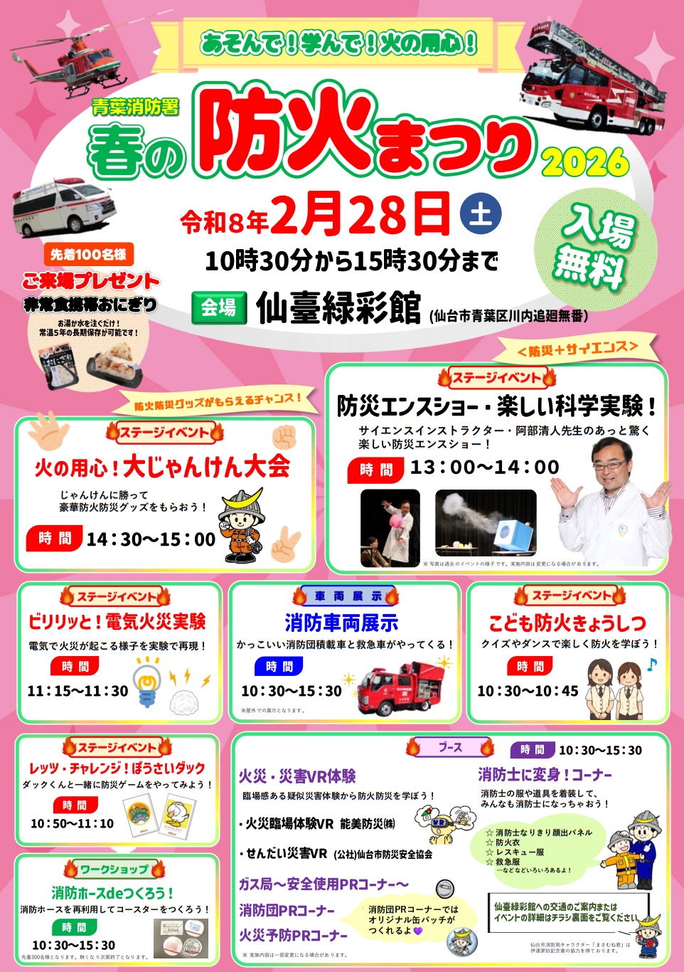 仙台市消防音楽隊による「青葉山ふれあいコンサート」などのステージや展…