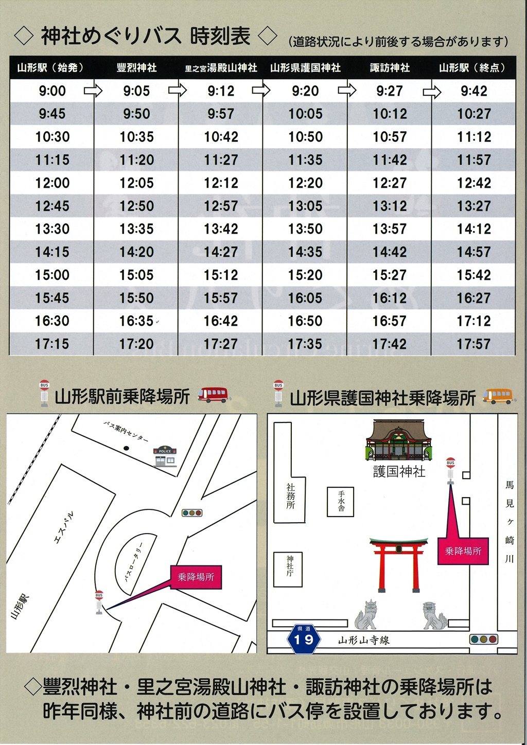 - 023-622-6358(神社めぐりバス事務局(諏訪神社))