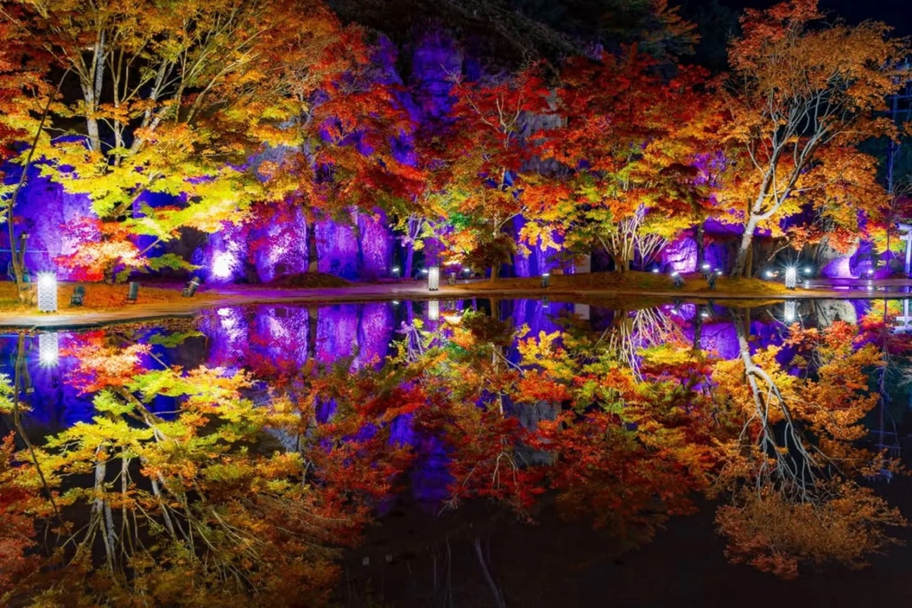 紅葉が包む十角三重塔、幻想的なライトアップが彩る松島の秋