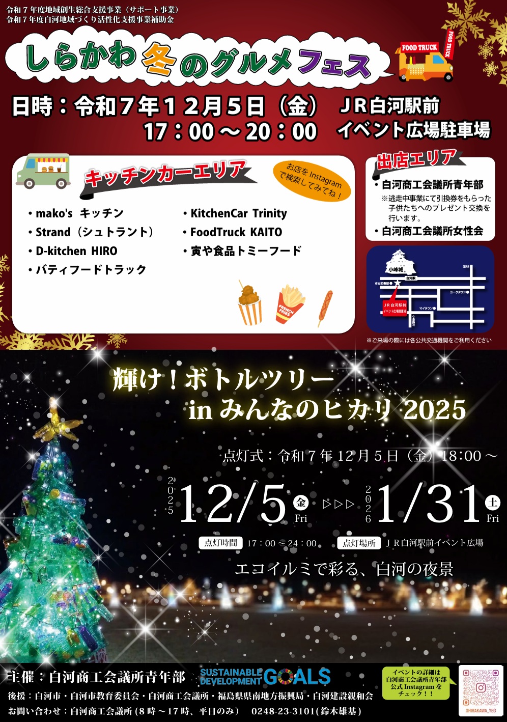 白河駅前を中心に約5万2千球のイルミネーションやペットボトルツリーが彩ります。