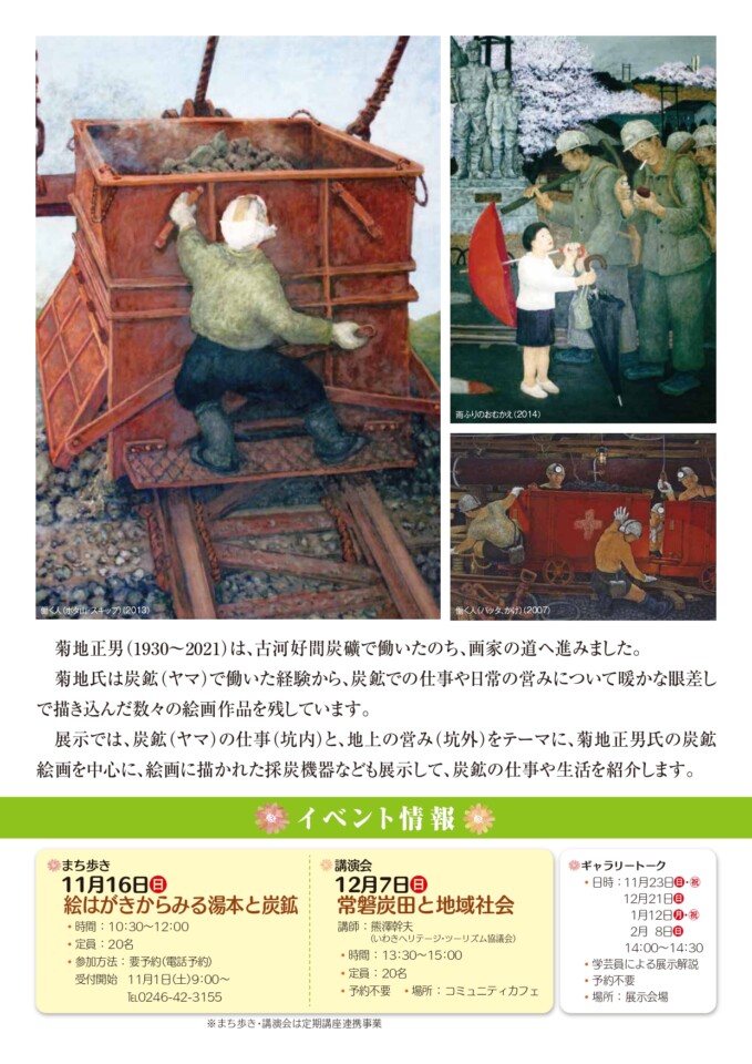 菊地正男氏の炭鉱絵画を中心に、絵画に描かれた採炭機器なども展示して、炭鉱の仕事や生活を紹介します