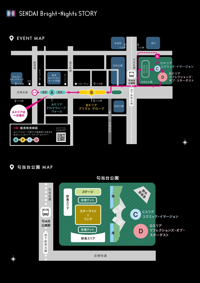 ※定禅寺通【Aエリア】・【Bエリア】は、中央緑道内を歩きながらイルミネーションの世界観をお楽しみいただくイベントです。車道からの観覧はできません。