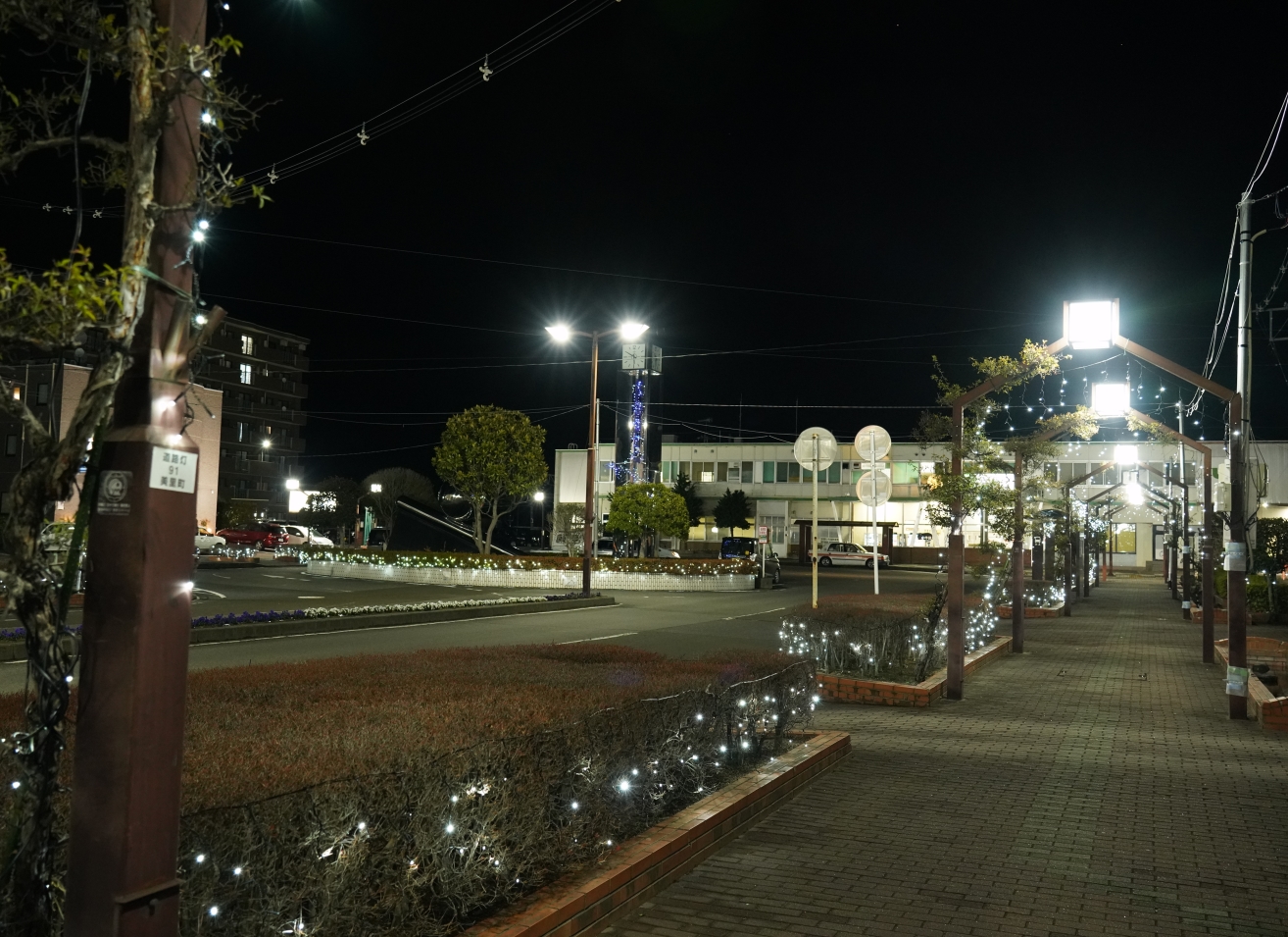 小牛田駅西口ロータリー付近がイルミネーションでライトアップ、点灯開始日12月13日はイベント開催。