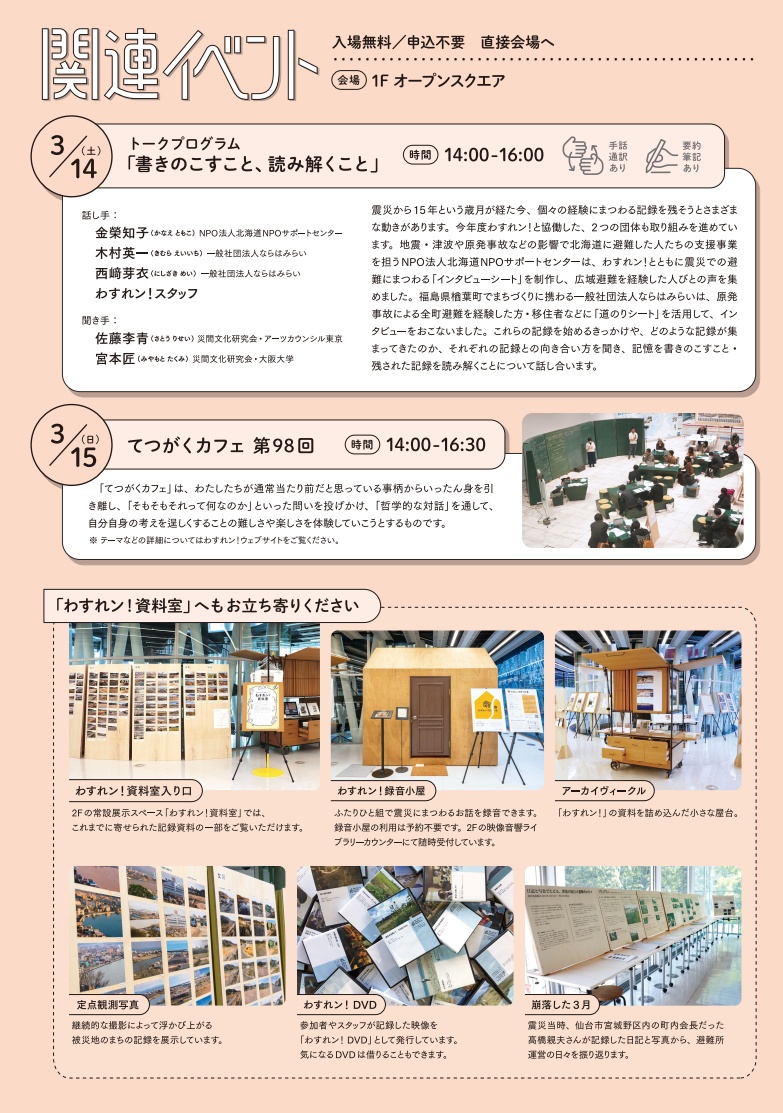 センター参加者による記録やプロジェクトを紹介する展示やイベントを行い、震災を振り返ります。