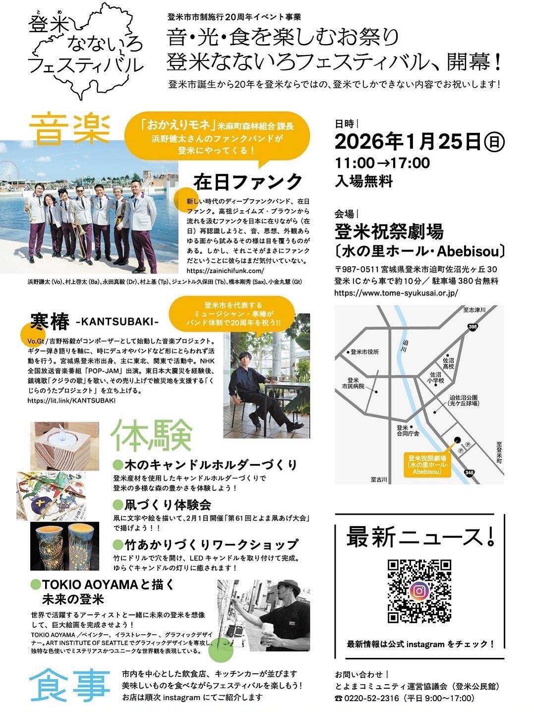 登米市市制施行20周年、音・光・食を楽しむお祭り。