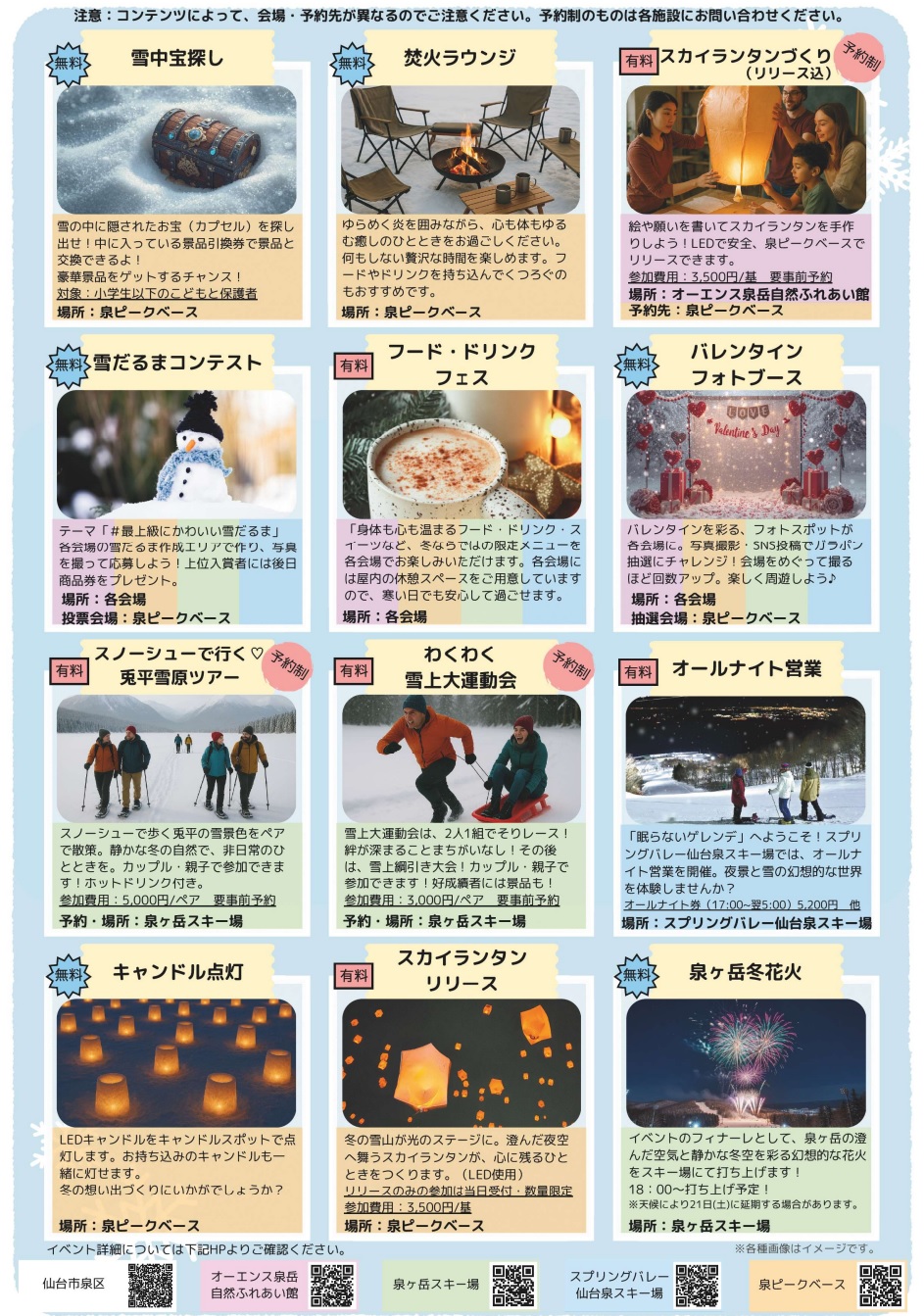 スノーアクティビティや雪中宝探し、夜は冬花火やスカイランタンなど各種企画が用意されています