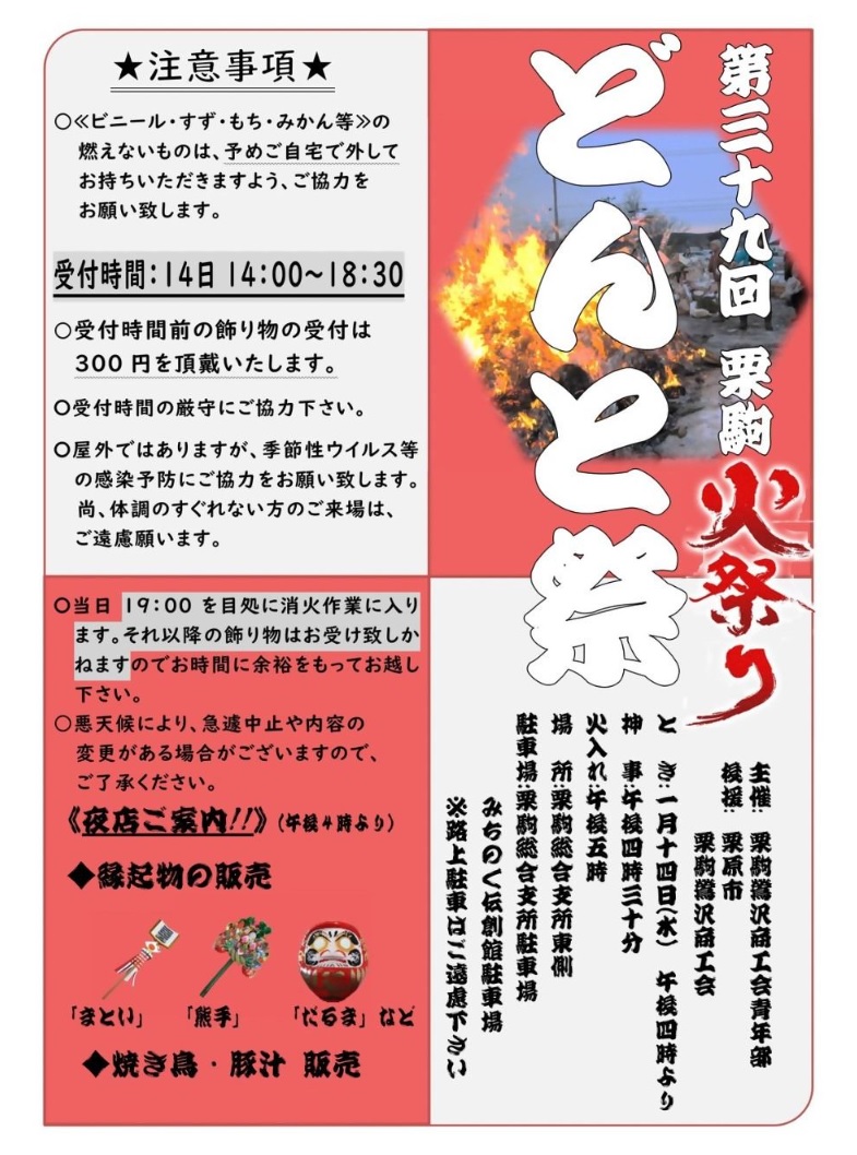古いお札やお守り、松飾り等の焚き上げを行いますとともに、1年間の無病息災・商売繁盛・五穀豊穣等を祈願します