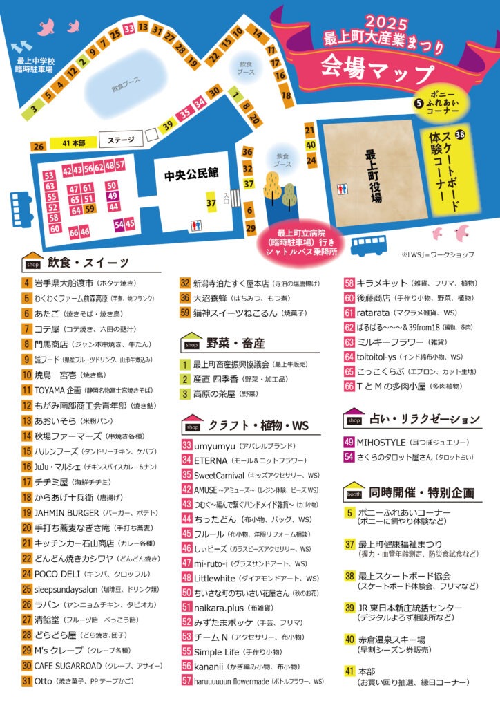 最上町の農産物販売や飲食店・クラフトなどのお店が多数出店し、ライブも開催されます。
