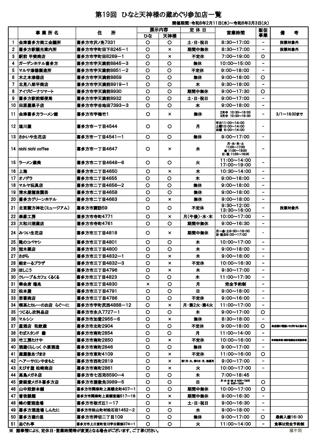 - 喜多方市内 参加店51店舗