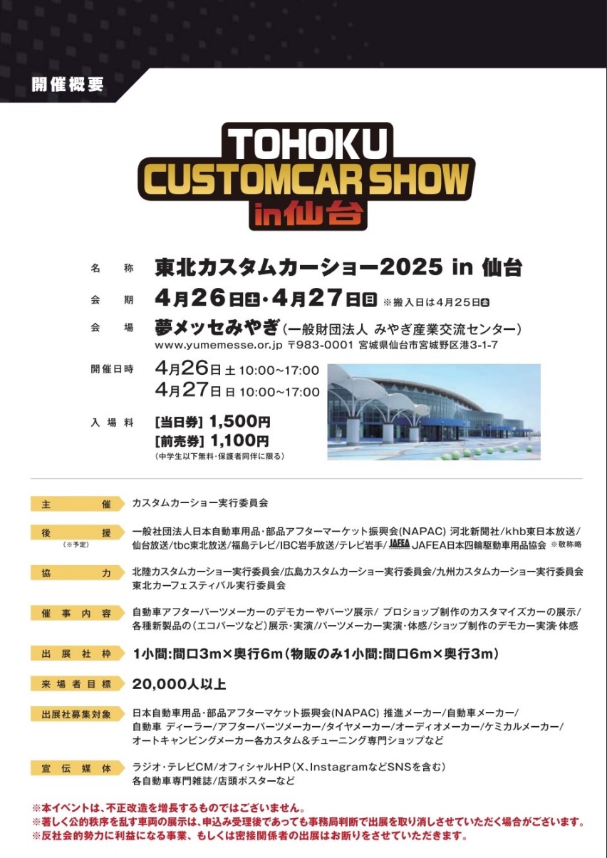 デモカー展示やパーツ・グッズ販売など東北最大級の屋内カーイベント。