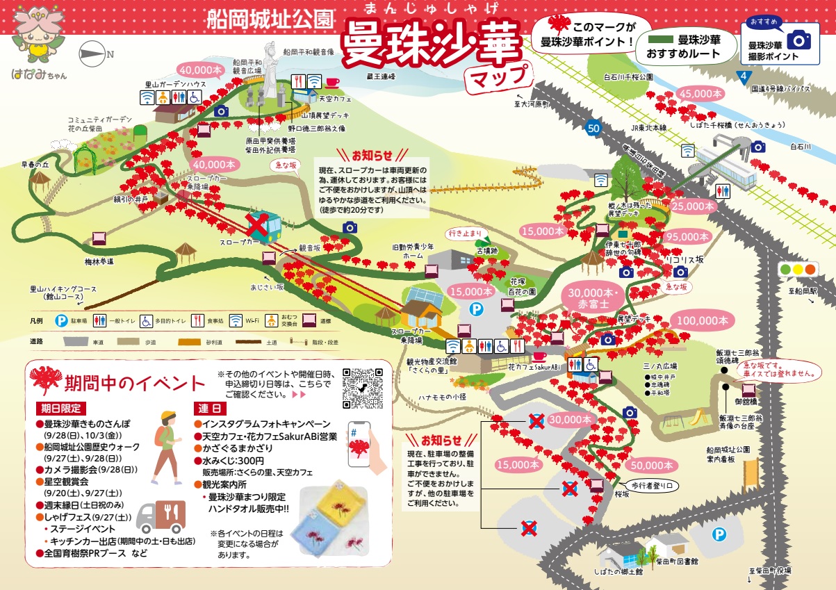 約50万株の曼珠沙華(彼岸花)が咲き誇ります、期間中は土日を中心に様々なイベントも開催されます