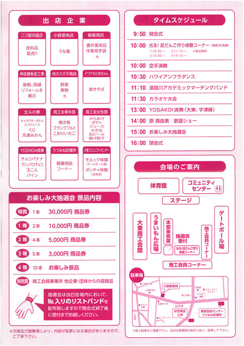 歌謡ショーやフラダンス、YOSAKOIなどのステージイベントのほか、お楽しみ抽選会もあります