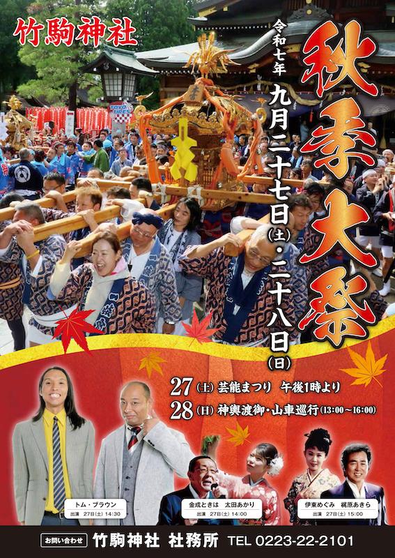 豊穣の秋を迎えて御神恩に感謝を捧げる祭りで、宵宮祭では芸能まつりなどが神社外苑で開催され、翌日には、竹駒音頭・竹駒ばやしの山車などが繰り出します。