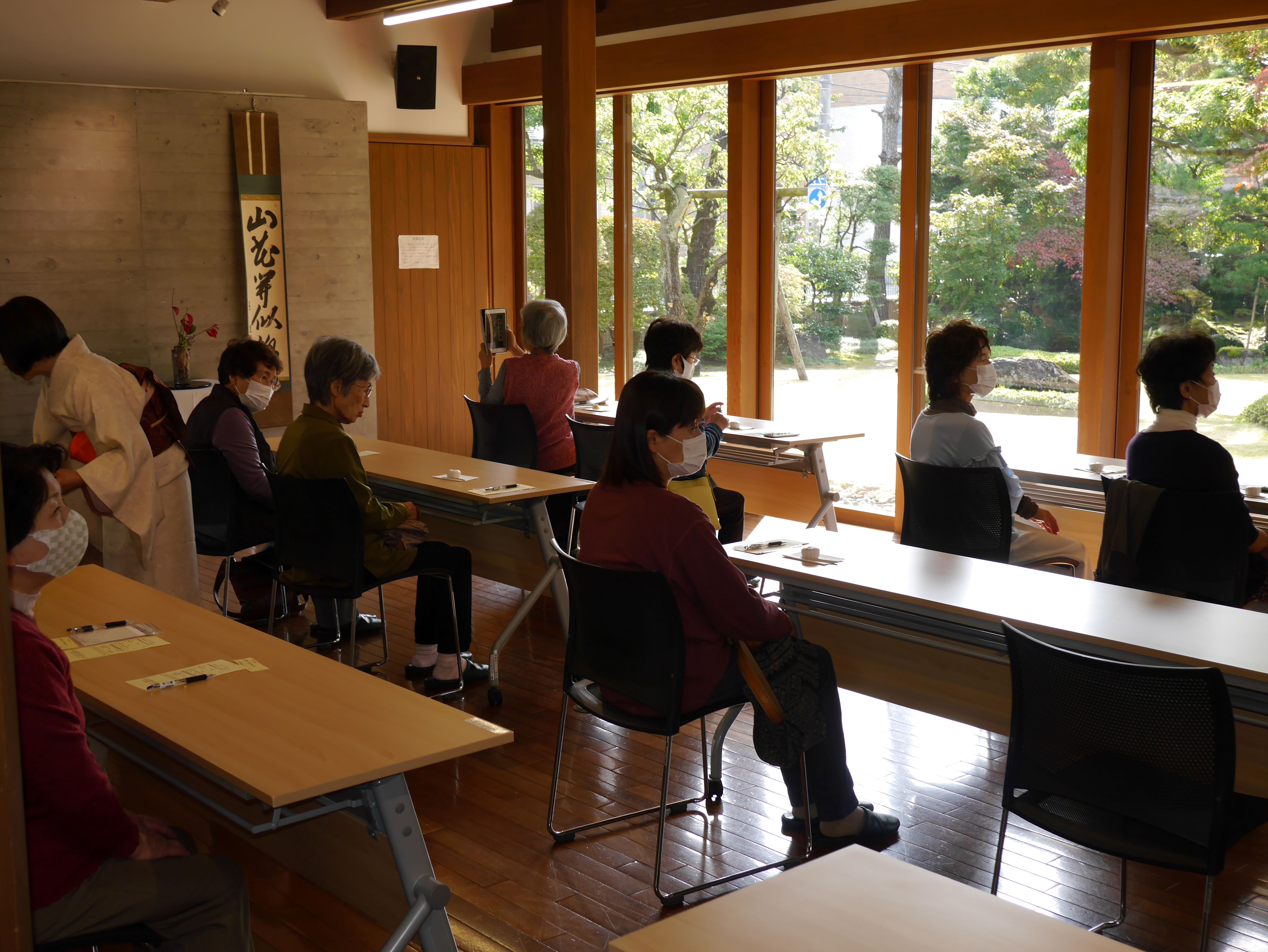 洗心庵の多目的ホールで椅子に座り、水の流れと紅葉彩る日本庭園を鑑賞しながら、お抹茶とお菓子をいただく催しです。