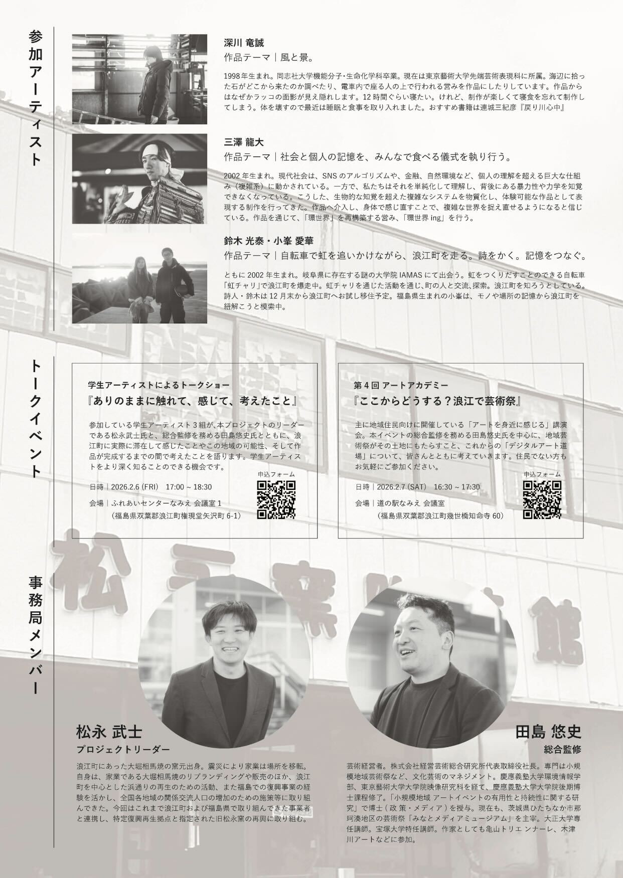 内容:総合監修を務める田島氏が、地域芸術祭がもたらすもの、本プロジェクトのこれからを語る。