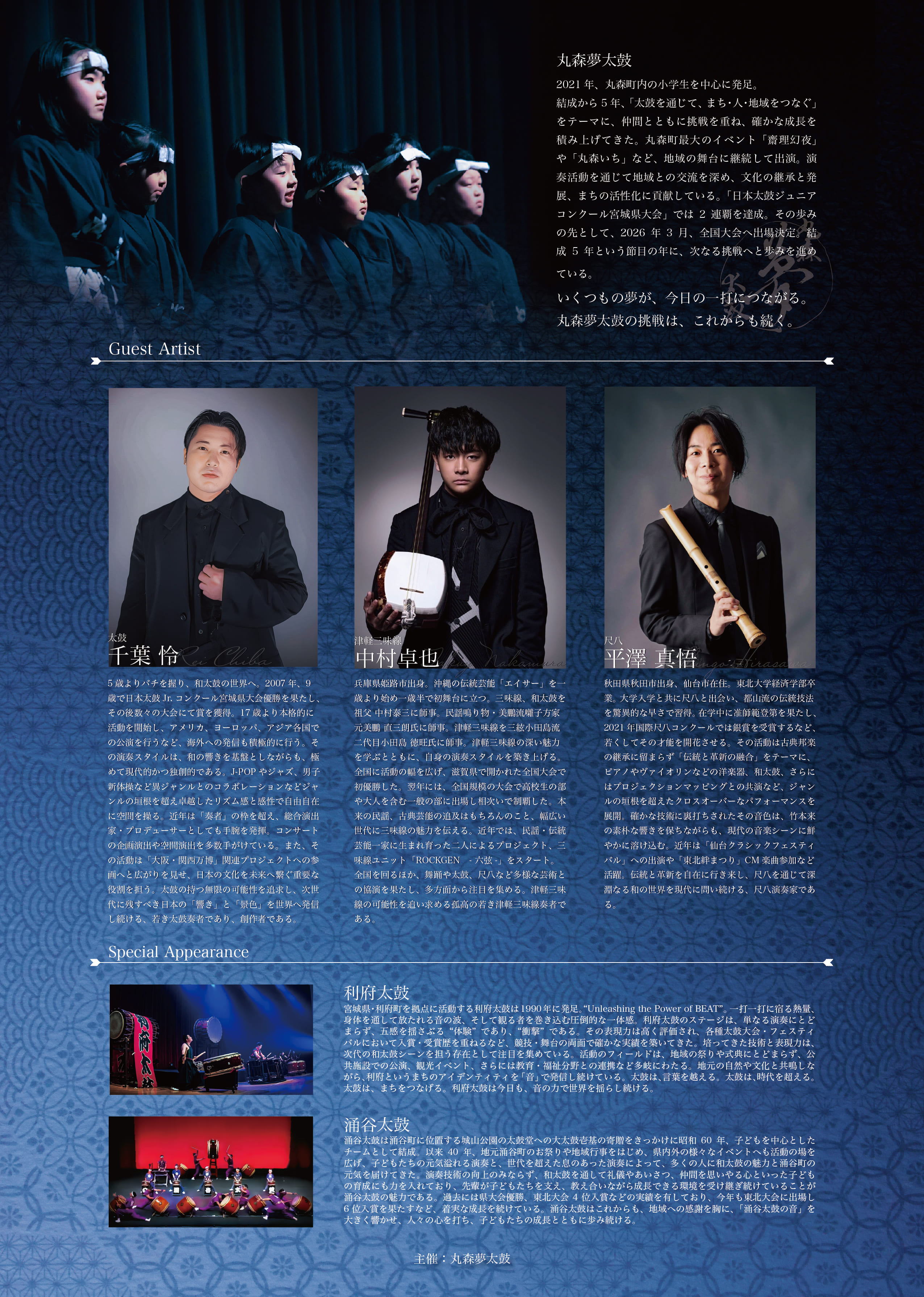 地域の期待を背負い、丸森から全国へ。5年間の軌跡と未来への希望が詰まった、この日限りの特別なステージ。単なる演奏会ではなく、ひたむきな「努力」と、太鼓にかける「情熱」が響き渡ります。地元・宮城の地で放たれる、魂を込めた「太鼓の音色」をお届けいたします。