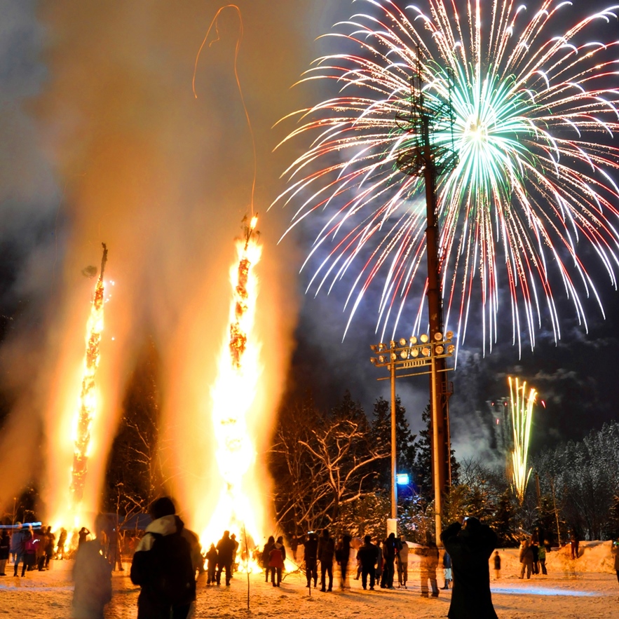 三島町のサイノカミや団子さし、鳥追いなどの冬の伝統行事を再現しています
