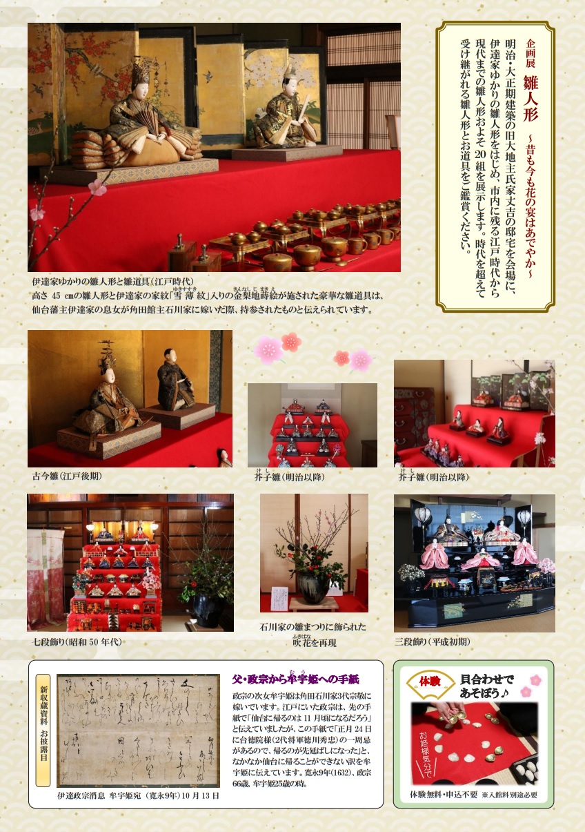 伊達家ゆかりの雛人形や江戸時代から現代までの雛人形が展示されます