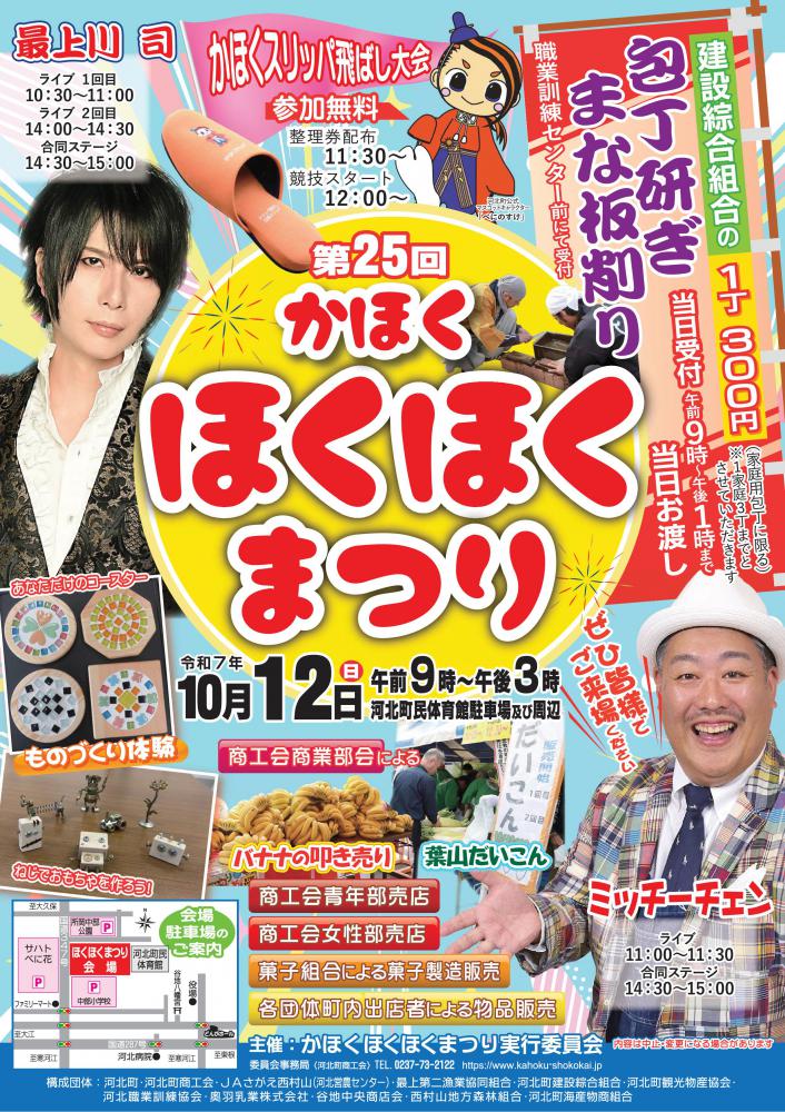 秋の恒例行事、各団体による物産販売や、かほくスリッパ飛ばし大会など開…