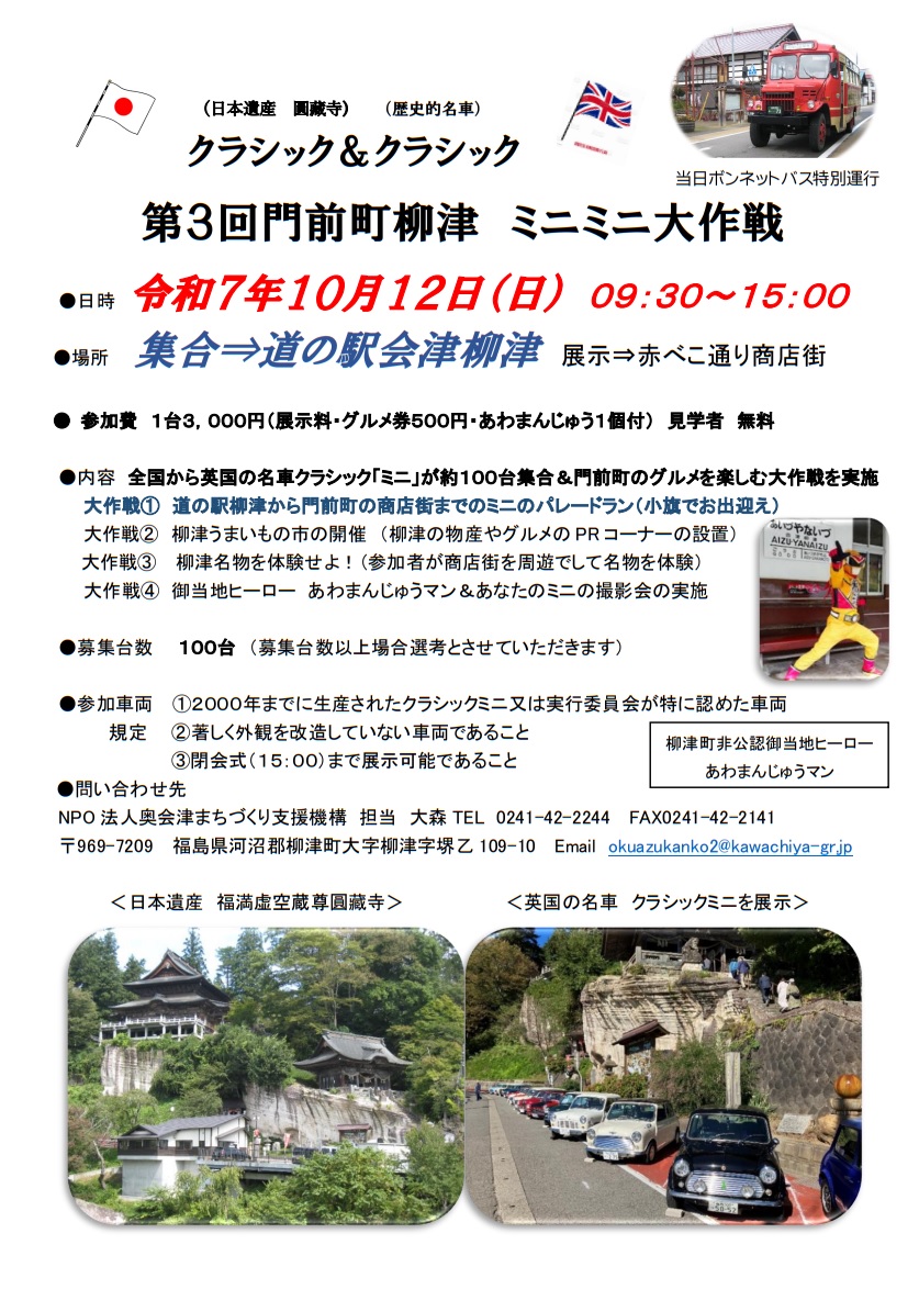 英国の歴史的名車「MINI」が、会津柳津・門前町の商店街へ大集合する…