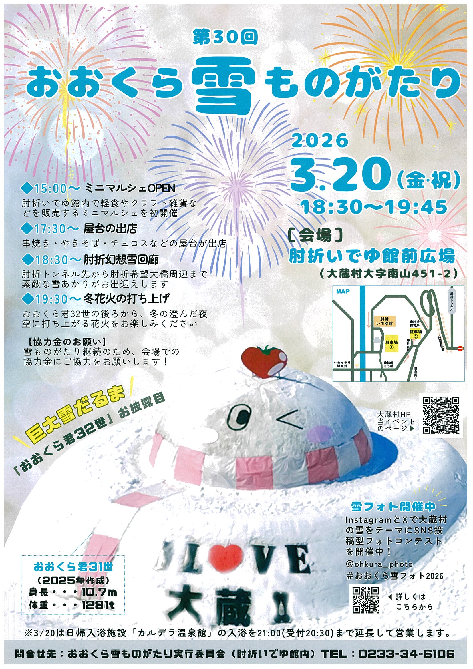 幻想雪回廊や巨大雪だるま「おおくら君」、冬の花火大会など開催されます