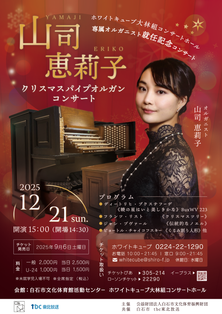 2025年12月21日(日)~12月21日(日)~ ホワイトキューブ大林組コンサートホール 専属オルガニスト就任記念コンサート~ 山司恵莉子クリスマスパイプオルガンコンサート