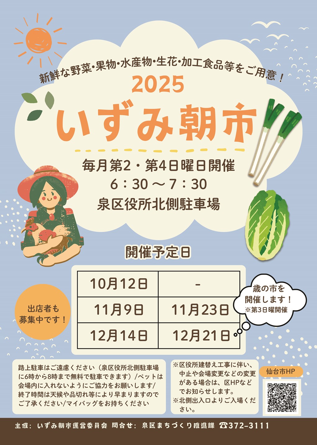 毎年4月から12月に開催しています。地元で生産した新鮮な野菜や果物、…